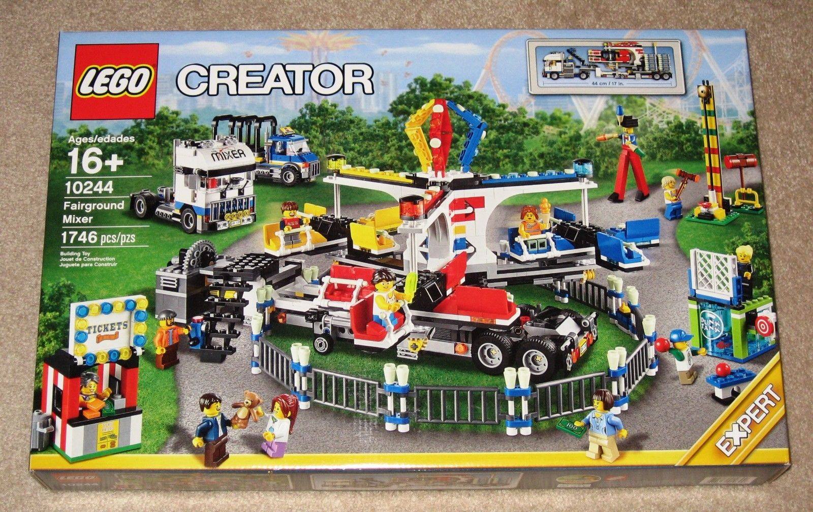LEGO 10244 Creator Expert Karuzela to zestaw, który pojawił się na rynku w 2014 roku, oraz składał się z 1746 elementów. Zestaw po złożeniu prezentuje się bardzo okazale, bowiem ma wymiary 30 cm wysokości, 45 cm długości i 31 cm szerokości. W pudełku znajdziemy imponującą liczbę mini figurek, bo aż 12 w tym: żongler na szczudłach, nurkująca panienka, siłacz, pani biletowa, kierowca ciężarówki/operator karuzeli, 2 kobiety, 2 dziewczynki, 2 chłopców i zemdlony mężczyzna. Karuzela jest napędzana korbką, ciężarówka z karuzelą mają otwierane drzwi, wycieraczki przedniej szyby oraz zdejmowany dach, dzięki któremu mamy dostęp do wnętrza umeblowanego łóżkiem i telewizorem. Ponadto w ciężarówce znajduje się budka z biletami, urządzenie do sprawdzania siły i zbiornik do nurkowania. Całość zestawu sprawia, że można się nim naprawdę super bawić. Jeszcze chyba w żadnym zestawie nie spotkałam się z taką dużą ilością figurek oraz elementów dodatkowych. Figurki jako takie wykonane są jak na LEGO przystało z dużą precyzją i dokładnością. Dzięki temu zestawowi możemy tworzyć różnorakie historie i przeżywać przygody w mobilnym parku rozrywki. Ponadto w zestawie znajdziemy bardzo wiele akcesoriów dodatkowych takich jak lody tradycyjne i na patyku, zielone wisienki, miś, maczugi do żonglowania oraz duży i mały młot do uderzania, co dodatkowo uatrakcyjnia nasz zestaw.