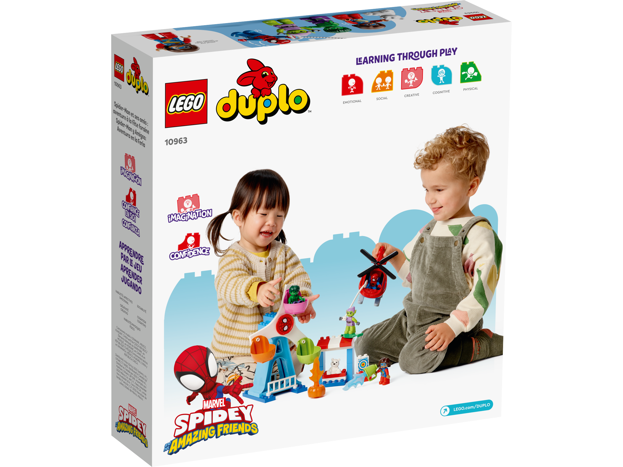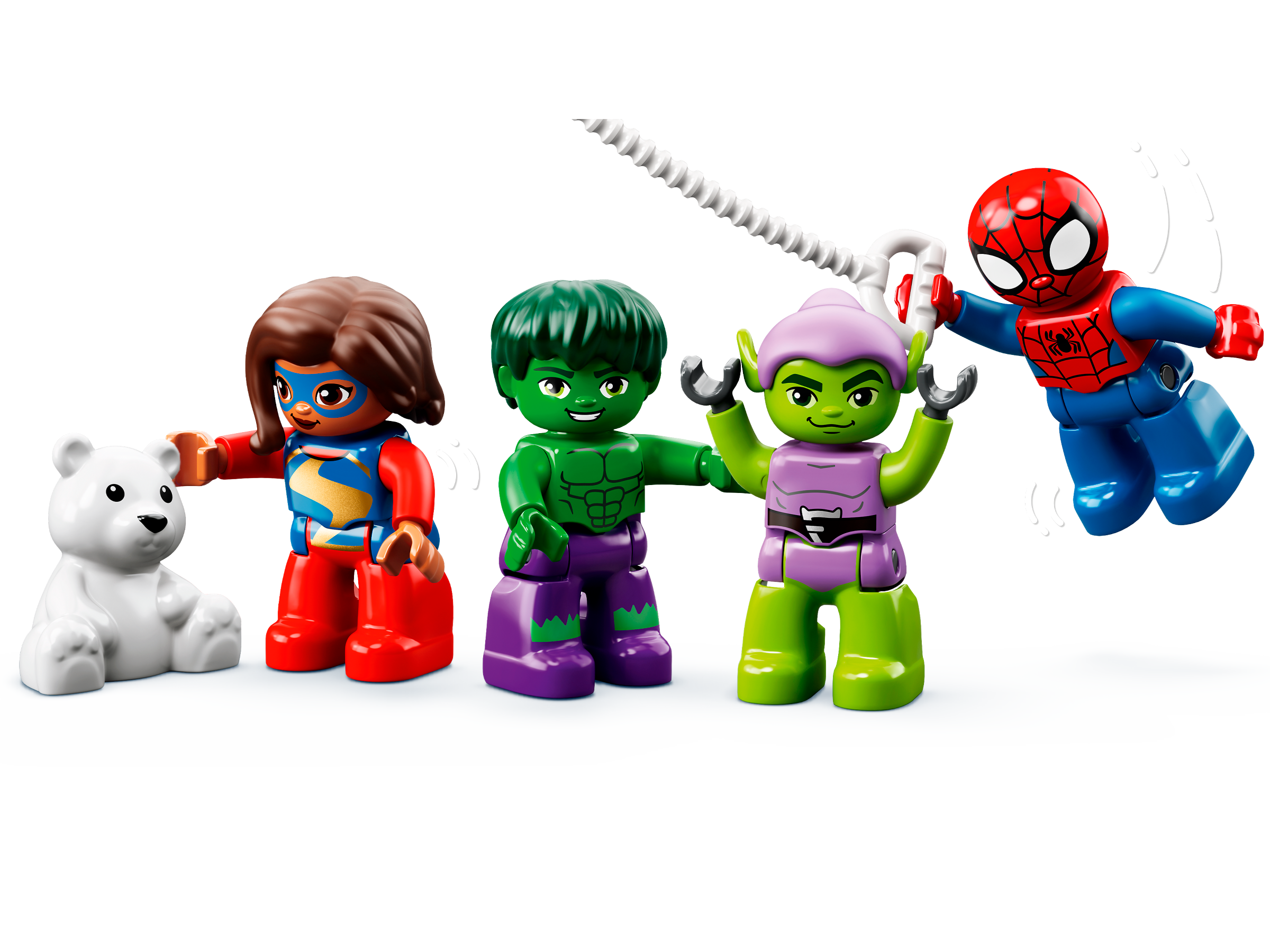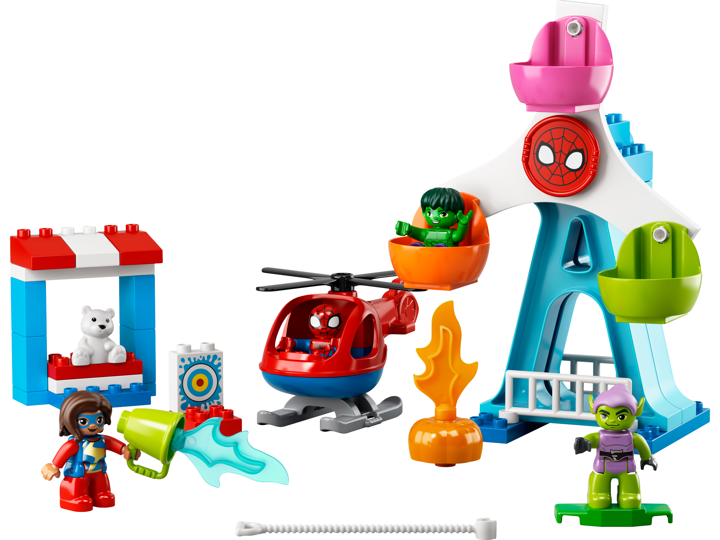 Ten wspierający rozwój zestaw do zbudowania i zabawy stanowi doskonałe wprowadzenie do świata superbohaterów Marvela. Młodzi fani emitowanego na platformie Disney+ serialu „Spidey and His Amazing Friends” znajdą tu cztery figurki DUPLO znanych postaci: Spider-Mana, Hulka, Pannę Marvel i Zielonego Goblina. Razem z nimi dzieci mogą przejechać się diabelskim młynem, wystrzelić płonące dyniowe bomby, pobawić się armatką wodną i przelecieć się helikopterem wyposażonym w obrotowy wirnik. Zabawa w odgrywanie kreatywnych przygód z superbohaterami pozwoli dzieciom rozwinąć ważne umiejętności.