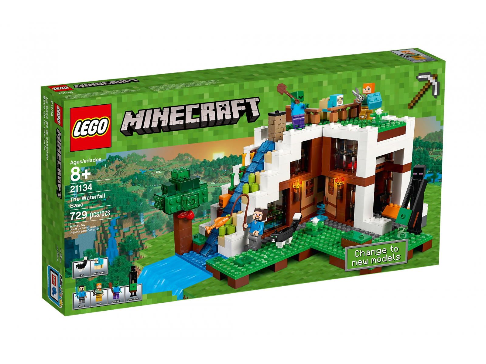 Klocki LEGO 21134 Minecraft - Baza pod wodospadem (Secret Waterfall Escape) Tanio zestaw LEGO 21134. Liczba klocków LEGO 729. Zestaw LEGO z roku 2017.