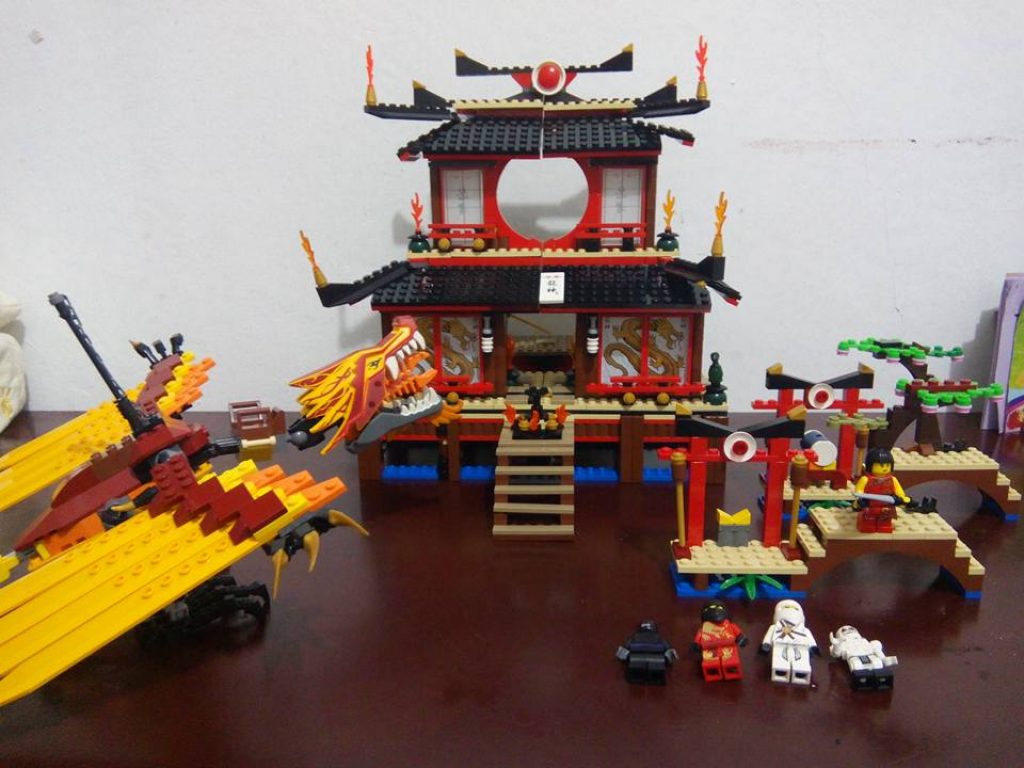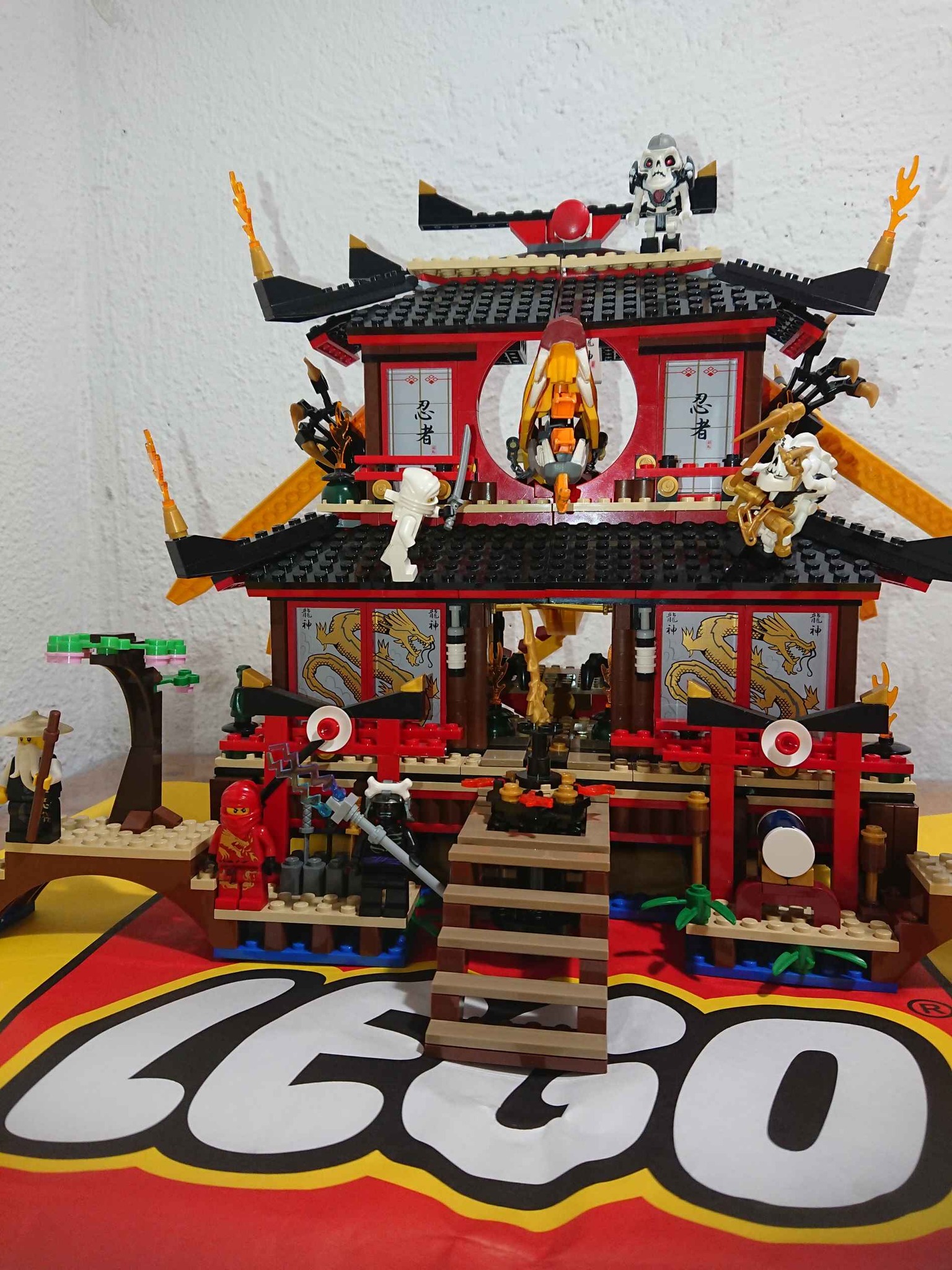 Muszę przyznać, że świątynia to solidna konstrukcja. Posiada ona podstawę z klocków imitujących drewno, dwa piętra oraz wiele azjatyckich akcentów, które oddają klimat miejsca. Ładnie prezentują się tu naklejki z wizerunkiem smoka i chińskie litery. W samym centrum placu przed świątynią znajduje się złoty miecz Spinjitzu. Na zewnątrz świątyni znajdziemy wiele ozdobników, które są nawiązaniem do ognia. Obok świątyni dodatkowymi elementami są platformy, na których spoczywają bronie oraz drzewo.