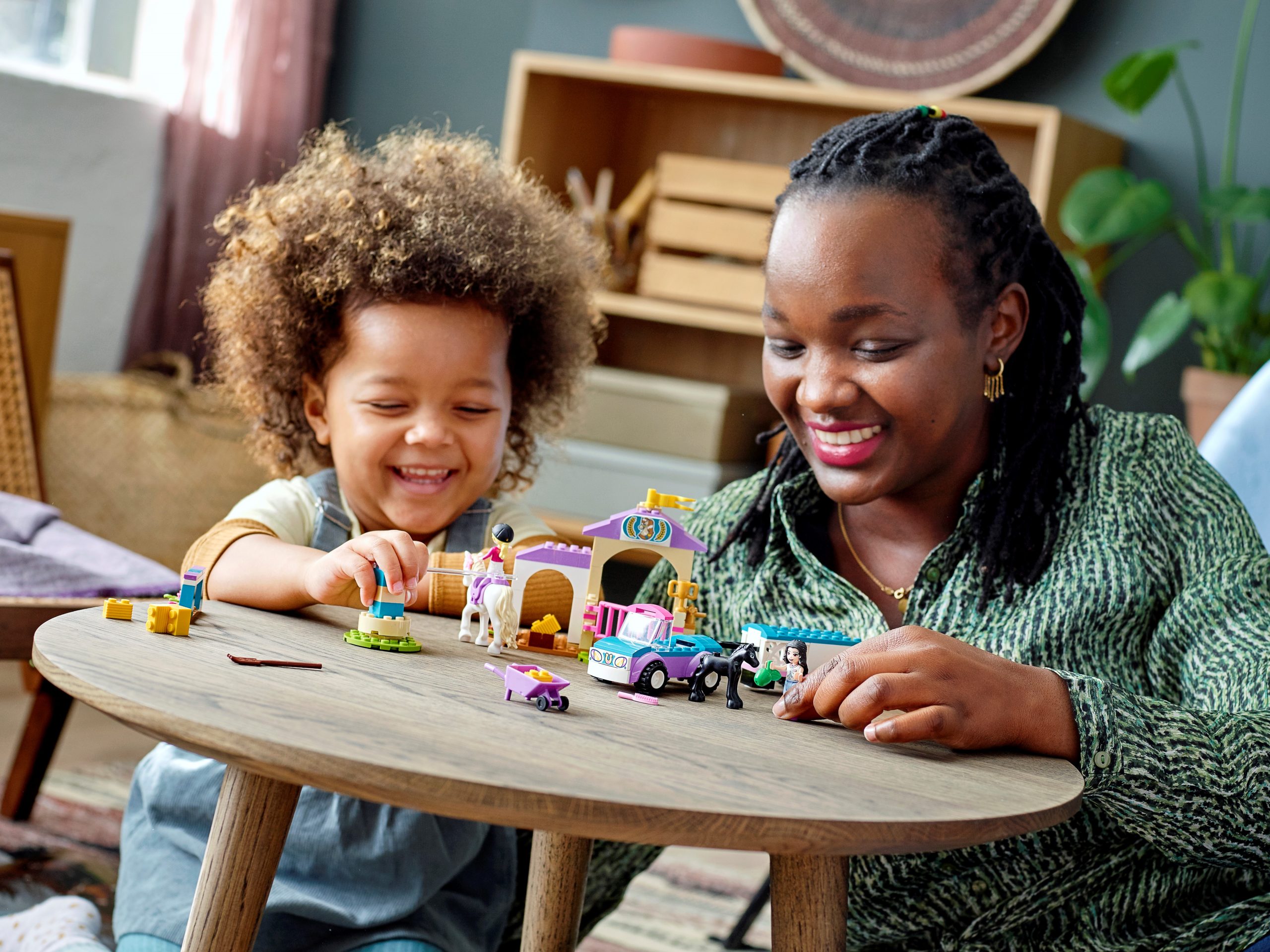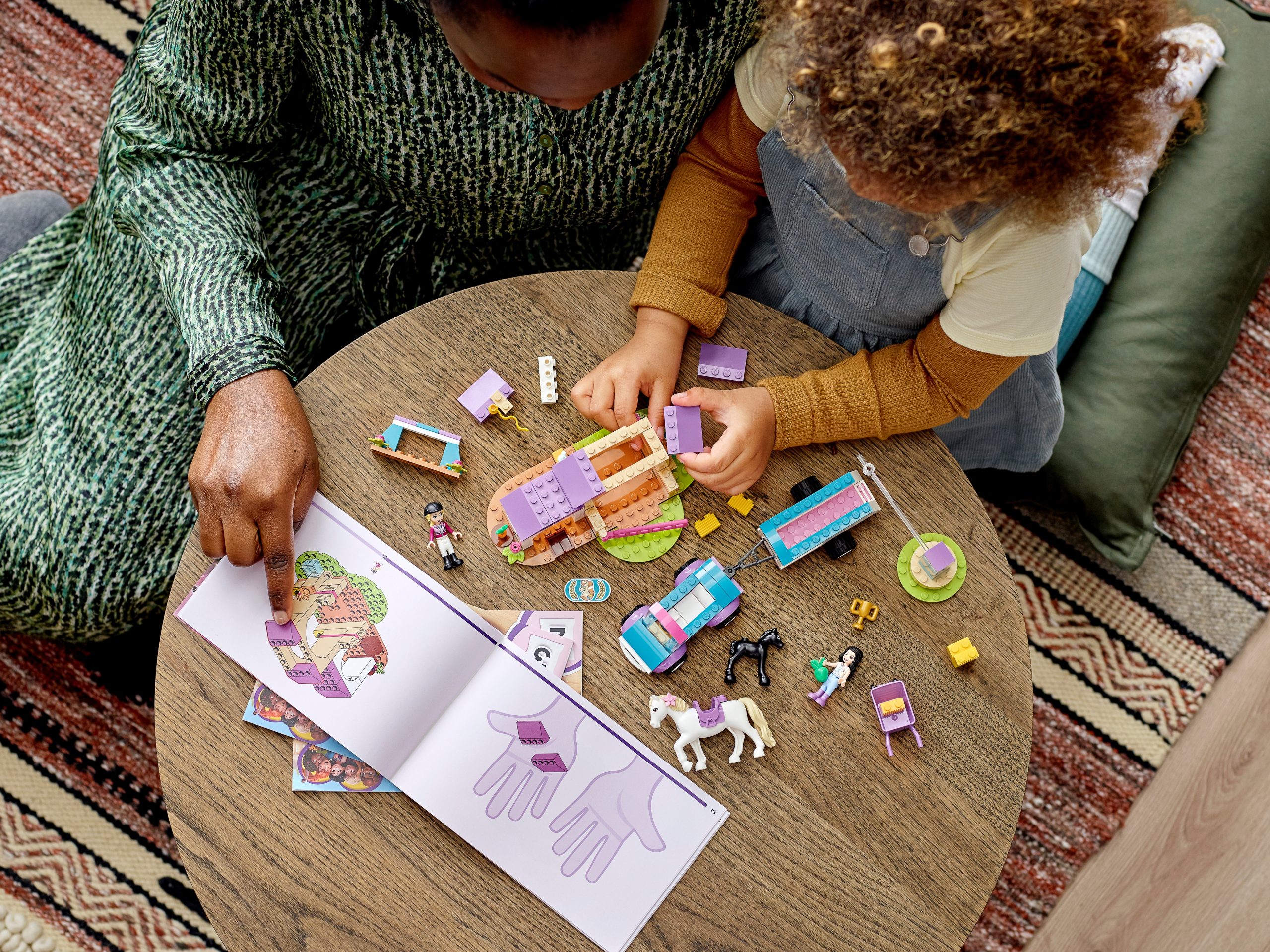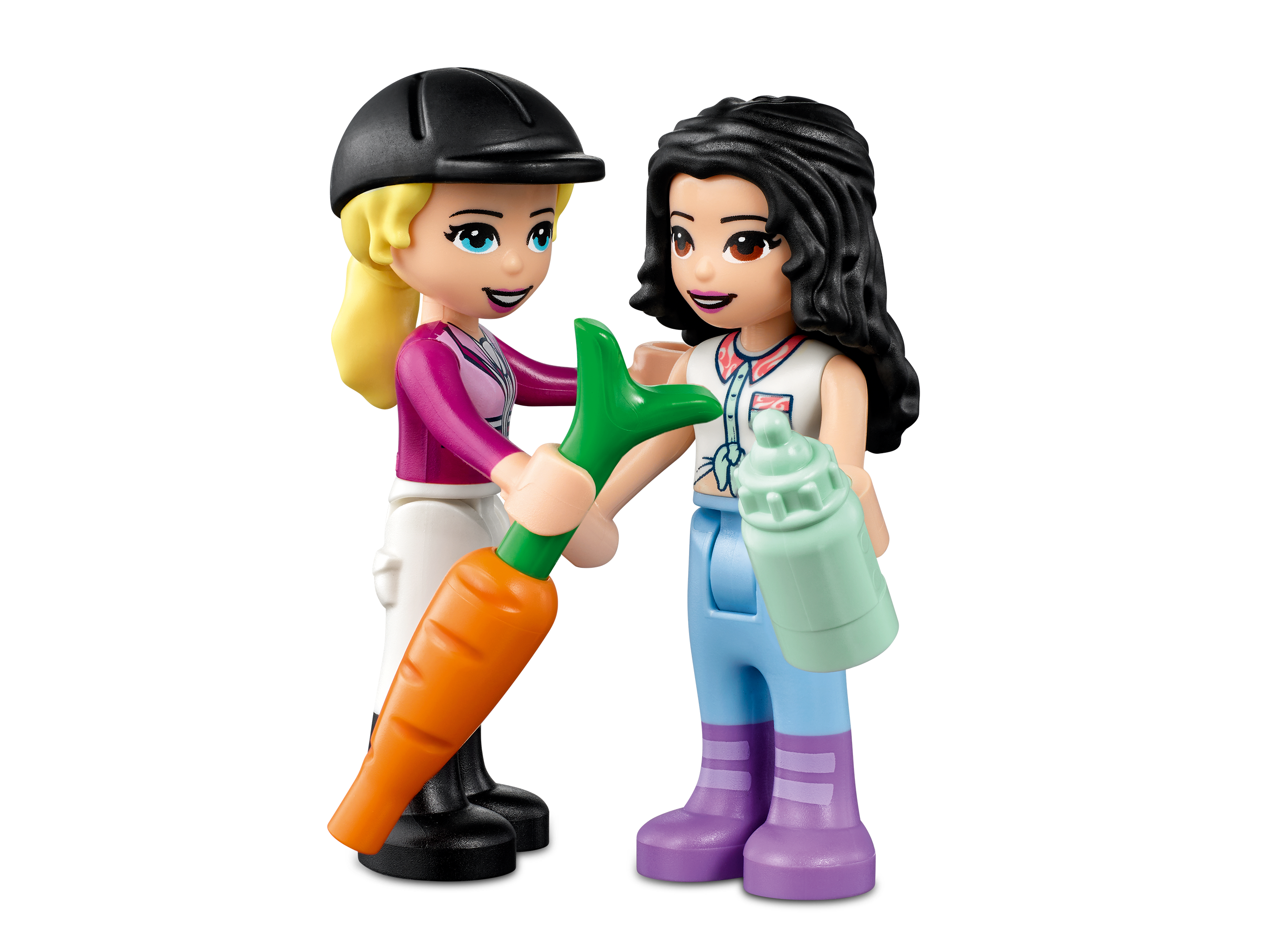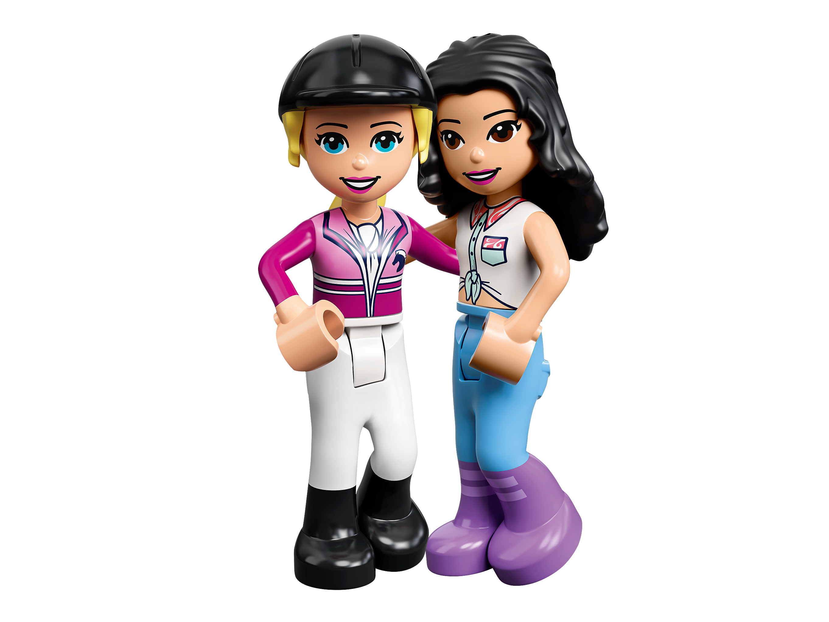 - Model zawiera samochód dla przyjaciółek LEGO® Friends, przyczepę dla konia i stajnię z zestawem do pielęgnacji. Są tam także przeszkody skokowe i wodze treningowe, aby dzieci mogły uczyć konia chodzenia po wybiegu.