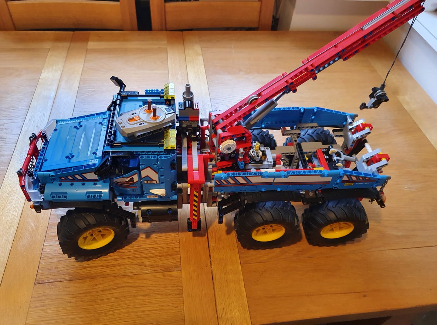 W pudełku znajdziemy również silniki Power Functions (duży silnik i średni silnik) oraz pilot zdalnego sterowania zasilany bateriami. Po zamontowaniu możemy sprawić, że będziemy kierować holownikiem, poruszać się do przodu, do tyłu, wysuwać podpory, obracać, podnosić się i opuszczać wysięgnik, a także podnosić i opuszczać wyciągarkę. To właśnie możliwość zdalnego sterowania holownikiem jest największym atutem tego zestawu. Dobrze skomponowany zestaw sprawia, że technicznie pojazd porusza się bardzo płynnie, sprawnie oraz pokonuje niewielkie przeszkody na swojej drodze. Całość konstrukcji jest bardzo stabilna i precyzyjna, a karoseria wygląda dość przyzwoicie jak na taką maszynę.