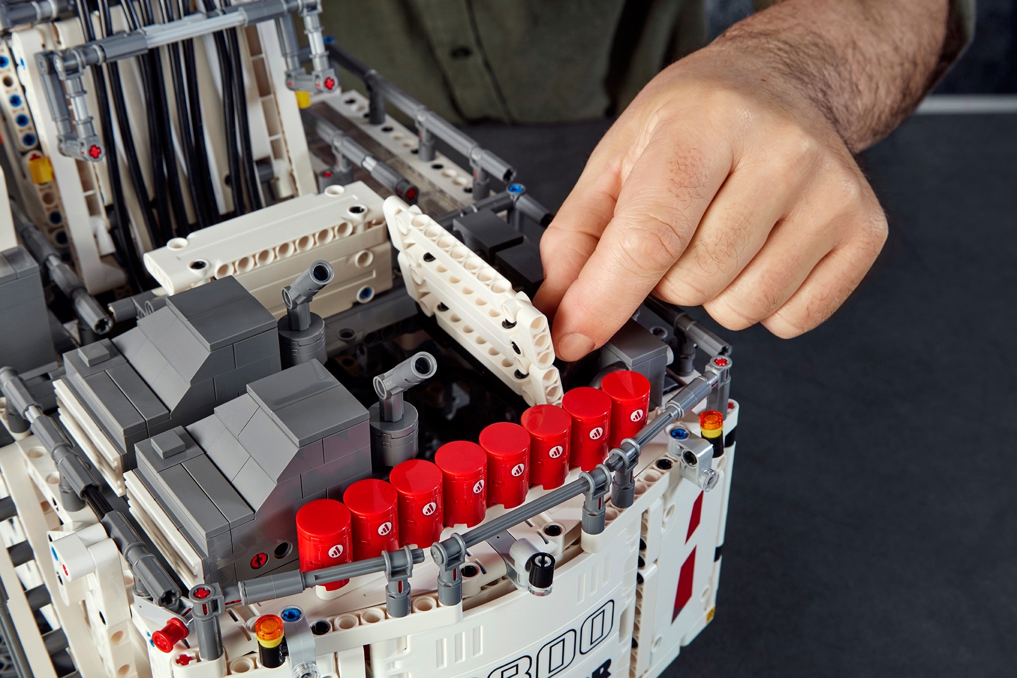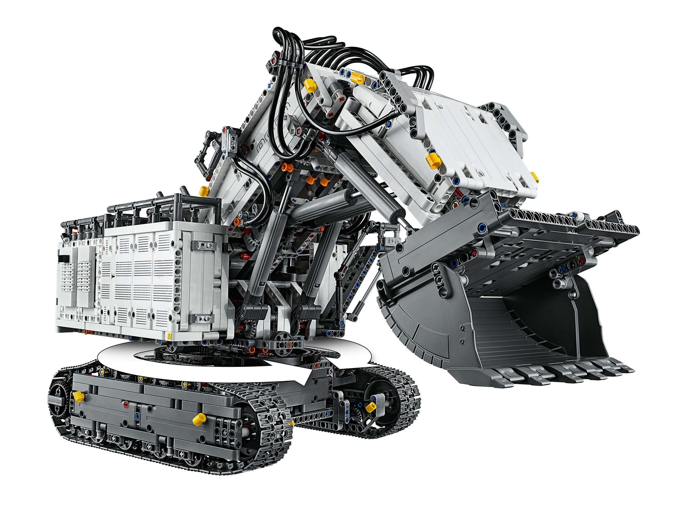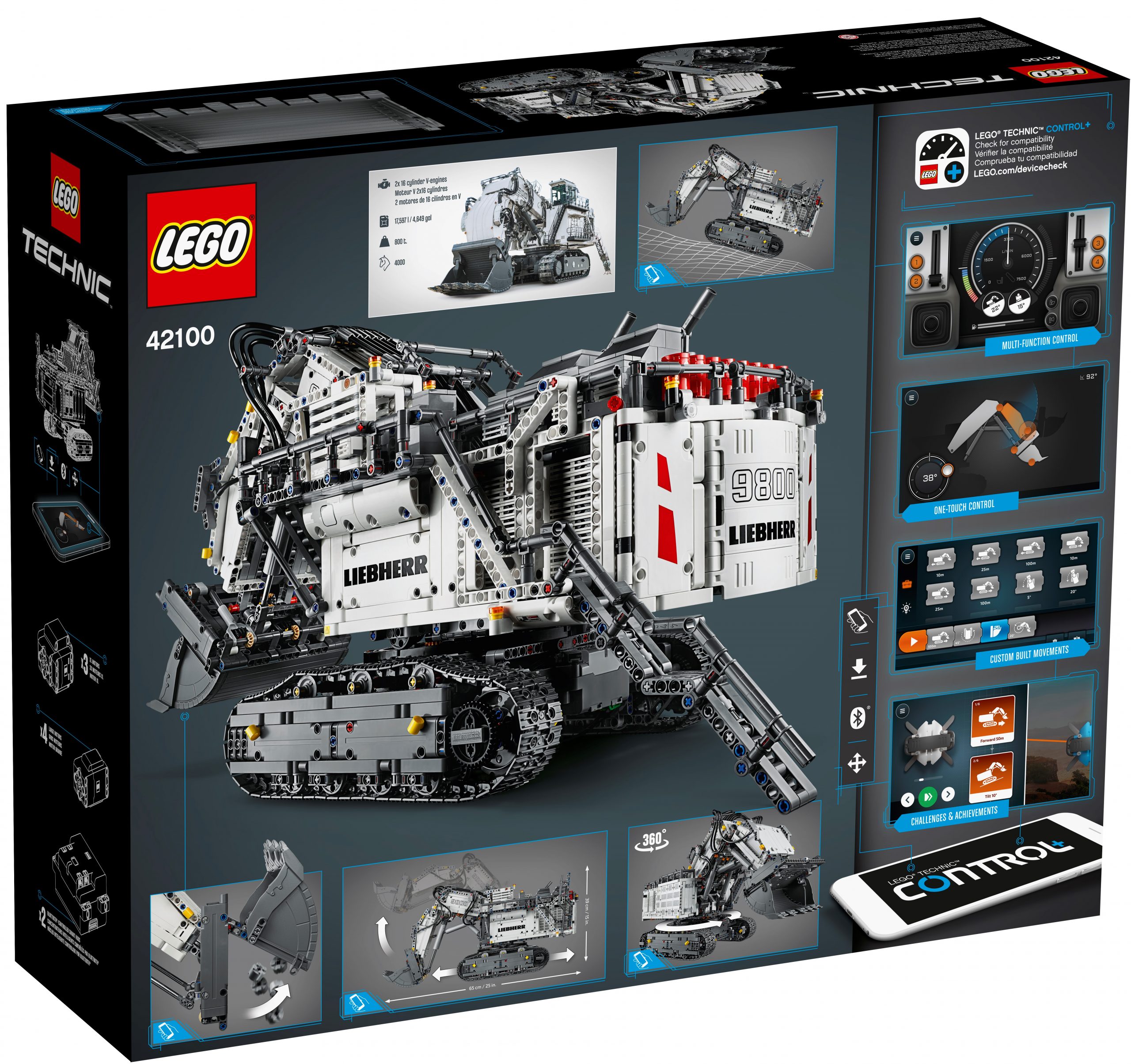 LEGO® 42100 Technic – Koparka Liebherr R 9800 to koparka składająca się z ponad 4100 elementów, jest największym zestawem LEGO Technic, jaki kiedykolwiek powstał. Wśród tych elementów są dwie inteligentne jednostki sterujące i aż siedem silników.
