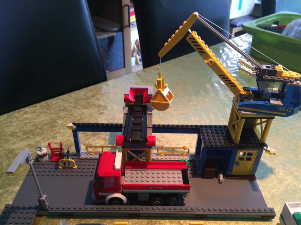 Przyszła pora na opisanie dźwigu transportowego, który jest praktycznie złączony z całą częścią zestawu, nie licząc transportowca. Dźwig posiada otwierane drzwi, przez które możemy wprowadzać minifigurkę do środka kabiny sterującej. Samym dźwigiem możemy obracać o pełne 360 stopni, a jego ramieniem poruszać w górę i dół, co daje nam pełną sekwencję ruchów. Naszym zadaniem jest zabranie przez dźwig klocków z pokładu statku, aby przenieść je na taśmę, które następnie powędrują na pakę czerwonej ciężarówki. Całość dźwigu wykonana super, nie ma się do czego przyczepić, sporo detali takich jak pomieszczenie przed wejściem do dźwigu wyposażone w śmietnik, szafkę, wózek. Nie zabrakło nawet małego, szarego kota odpoczywającego na rogu mostu.