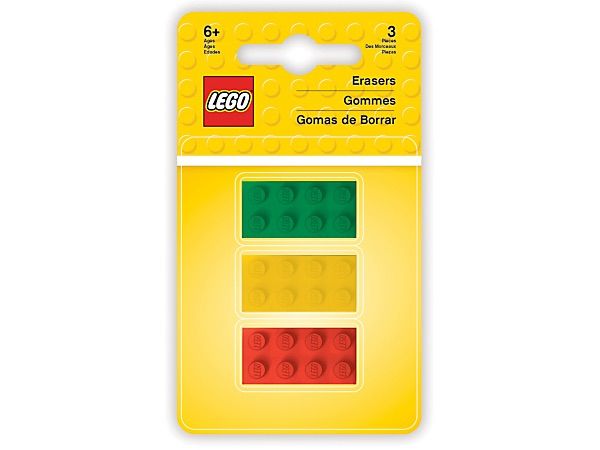 • Trzy gumki do ścierania (zielona, żółta i czerwona) w kształcie klasycznych klocków LEGO® 2×4.