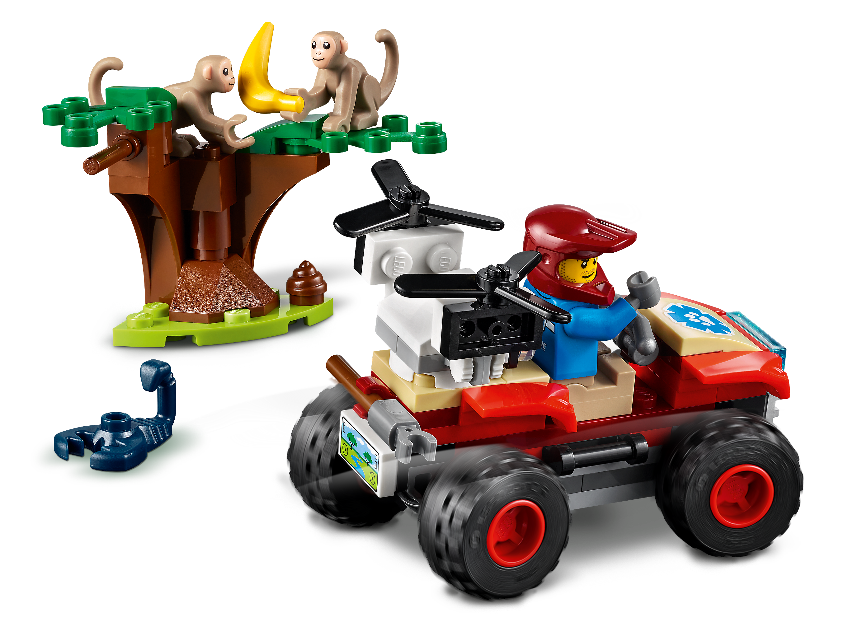 - W pudełku znajduje się wszystko, czego dzieci potrzebują do zbudowania quada ze skrętnymi kołami, chwytakiem i dronem, a także drzewo, banan, kupka, minifigurka badacza, dwie figurki małp i figurka skorpiona.