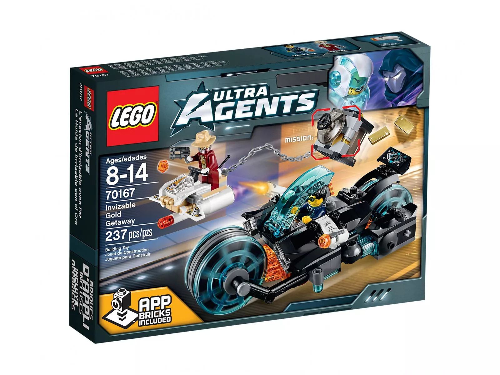 Pilnie wzywam ultraagenta Steve’a Zeala! Invizable włamał się do Banku Centralnego. Ucieka z sejfem pełnym złotych sztabek. Wskakuj do kabiny odlotowego tajnego motocykla i ruszaj w pościg ulicami miasta. Gdy zobaczysz sejf przykuty do pojazdu Invizable, przekręć koła, unieś się w powietrze i ścigaj go dalej. Wypal z miotacza i zestrzel pojazd złoczyńcy, zanim zmieni go w motorówkę i zacznie uciekać przez wodę! Kolejne scenariusze odegrasz w cyfrowym świecie na tablecie przy użyciu gadżetu Ultra App i 2 zestawów AppBrick! Zestaw zawiera 2 minifigurki: Ultraagent Steve Zeal i Invizable plus broń.