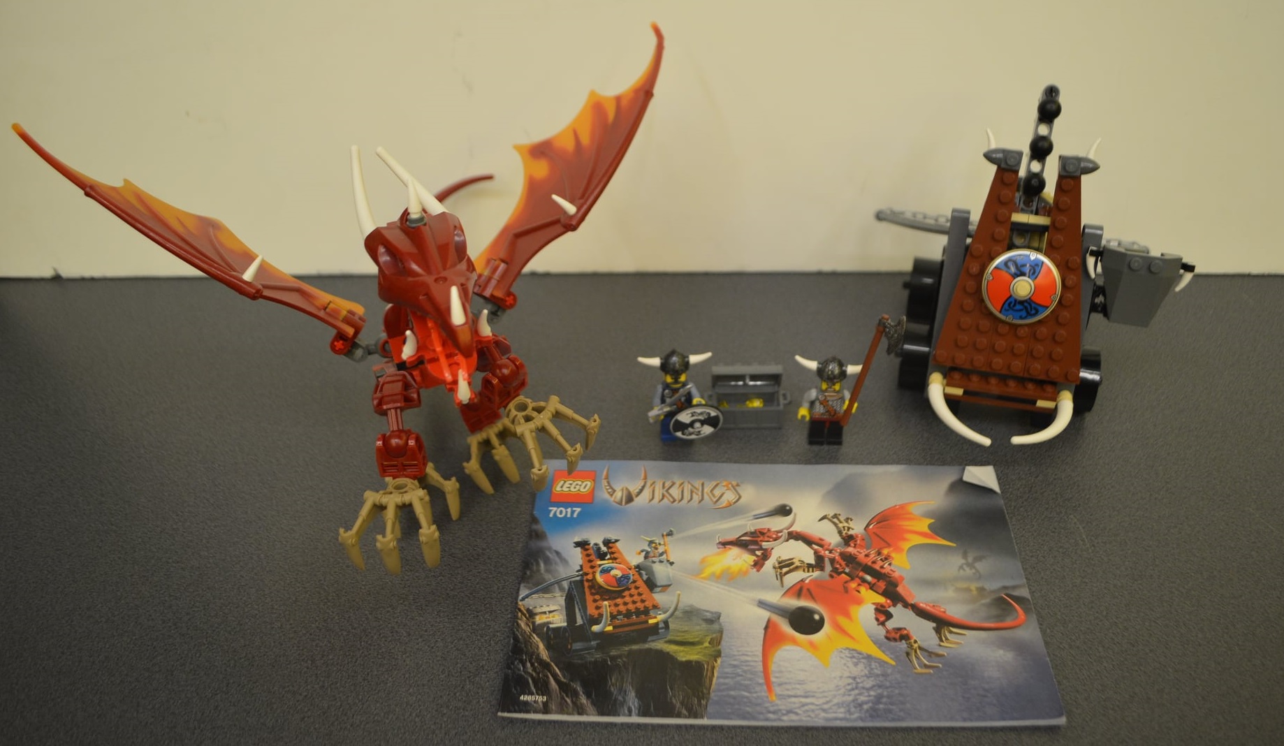 Zestaw 7017 czyli katapulta Wikingów kontra smok Nidhogg to niewielki zestaw, zawiera bowiem jedynie 225 elementów. Wśród nich znajdują się również 2 mini figurki, spośród których jedna jest unikalna i spotykana wyłącznie w tym zestawie. Jak sama nazwa pozwala się domyślać, figurki przedstawiają Wikingów, którzy akurat w tym zestawie toczą walkę ze smokiem. W czasach, kiedy Wikingowie żyli i rządzili północnym rejonami świata smoki czy czarodzieje były niemalże nieodłączną częścią tamtejszego świata. Z elementów znajdujących się w zestawie można złożyć działającą katapultę, która miota kulami w smoka, atakującego Wikingów. Pomimo tego, że zestaw nie jest duży, zawiera sporą ilość niedużych elementów, dlatego też producenci uznali iż jest odpowiedni dla dzieci w wieku od 7 do 14 lat. Podobnie jednak jak w przypadku wielu innych zestawów Lego, górna granica praktycznie nie istnieje, bowiem dorośli bawią się tymi klockami z taką samą chęcią jak dzieci. Katapulta oczywiście ozdabiana jest charakterystycznymi dla Wikingów oznaczeniami. Na pewno jednak największe wrażenie robi smok Nidhogg, który po złożeniu prezentuje się niezwykle imponująco. Zestaw prezentowany był przez firmę stosunkowo dawno, bowiem produkowany był od roku 2005 do roku 2006. Nie dziwi więc fakt, że przez wielu fanów i kolekcjonerów Lego postrzegany jest jako spory rarytas, zwłaszcza jeśli chodzi o zakup nowych zestawów, tych bowiem na rynku pozostało niewiele.