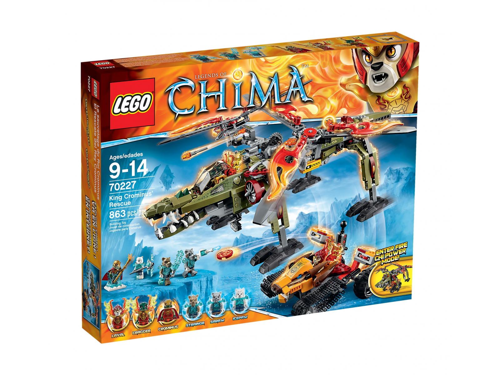 Król Crominus został schwytany przez złowrogich lodowych łowców. Uratować go może tylko przymierze plemion krokodyli i lwów. Posadź Craggera w otwieranym kokpicie potężnego ognistego helikrokoptera, uruchom wirniki i startuj! Zniż się, aby zabrać ognistego tropiciela Lavala, i ruszaj w pościg za wojownikami szablozębych i lodowych niedźwiedzi. Walcz z wrogiem za pomocą wystrzeliwanych rakiet i włącz system szybkiego zrzutu, aby posłać pojazd Lavala do walki. Wyceluj miotacze dysków ognistego tropiciela w lodowych łowców, aby uratować króla krokodyli z lodowej pułapki! Zestaw zawiera 6 minifigurek z wyborem broni i akcesoriami: Craggera, Lavala, króla Crominusa, Strainora, Sarawa i Icepawa.