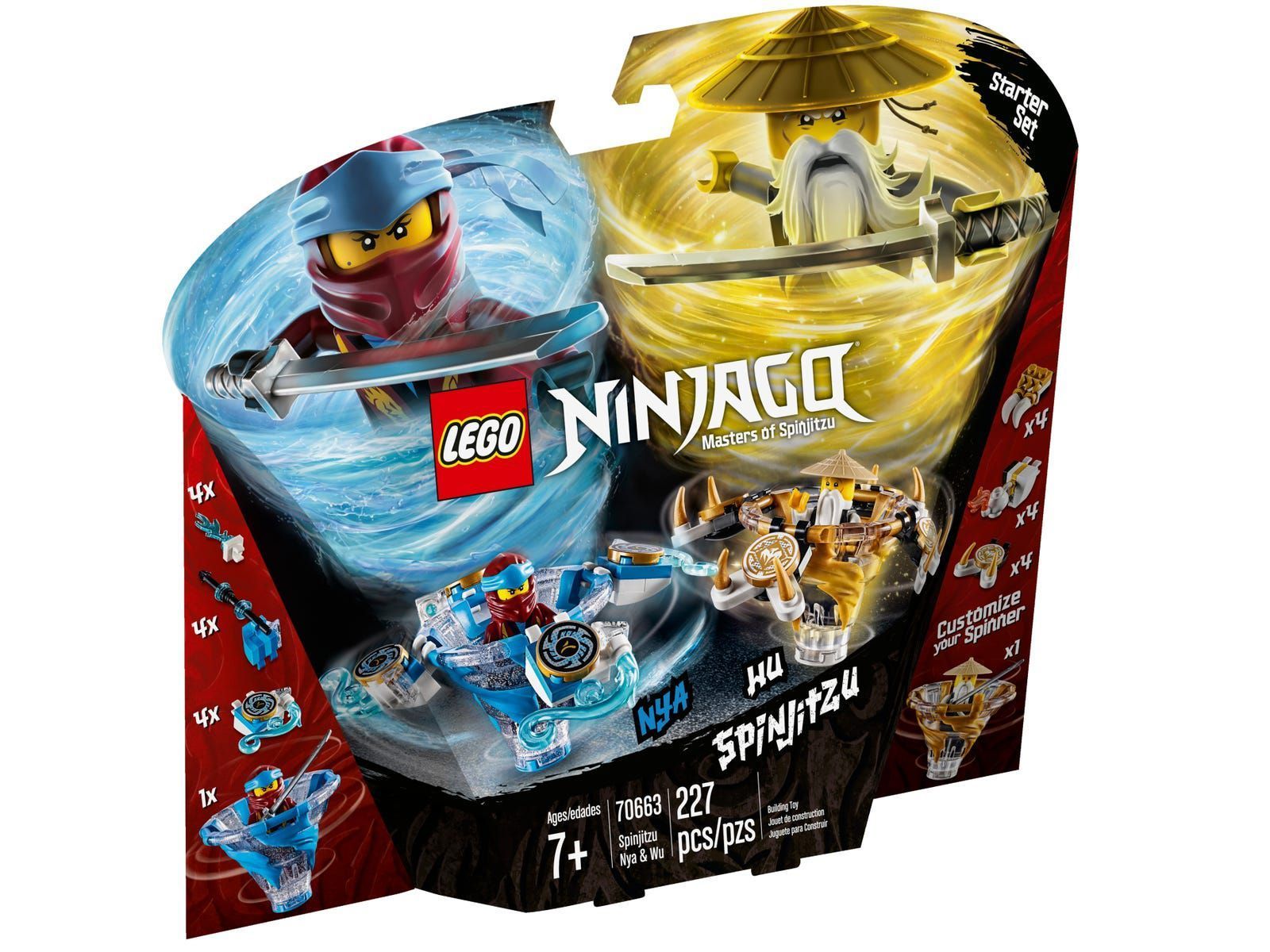 LEGO® NINJAGO® 70663 Spinjitzu Nya & Wu to podwójna dawka zabawy! Ta zabawka ninja zawiera Tornado wody — spinner NINJAGO Spinjitzu Nyi — oraz spinner Spinjitzu Wu. Każdy ze spinnerów ma nową podstawkę LEGO NINJAGO (nowość na styczeń 2019 r.) i trzy dodatki umożliwiające wybór trybu bojowego, obronnego lub wyścigowego. Eksperymentuj z różnymi technikami, twórz własne wyzwania lub zmierz się z przyjaciółmi — możliwości zabawy są nieograniczone. Ten kreatywny zestaw konstrukcyjny zawiera minifigurki Nyi i Wu z katanami oraz sześć stojaków do zbudowania, na których można ustawić doczepiane bronie i elementy.