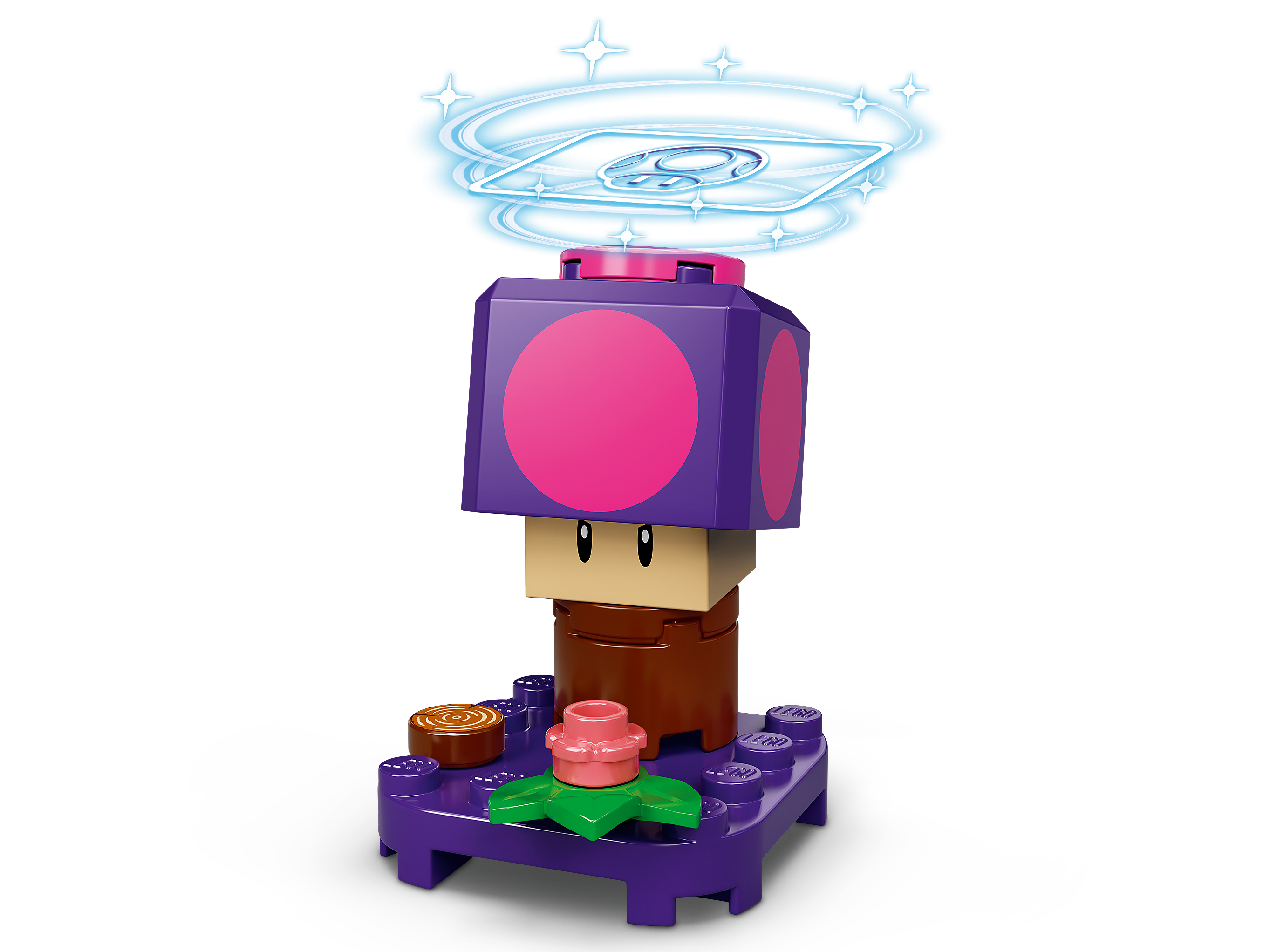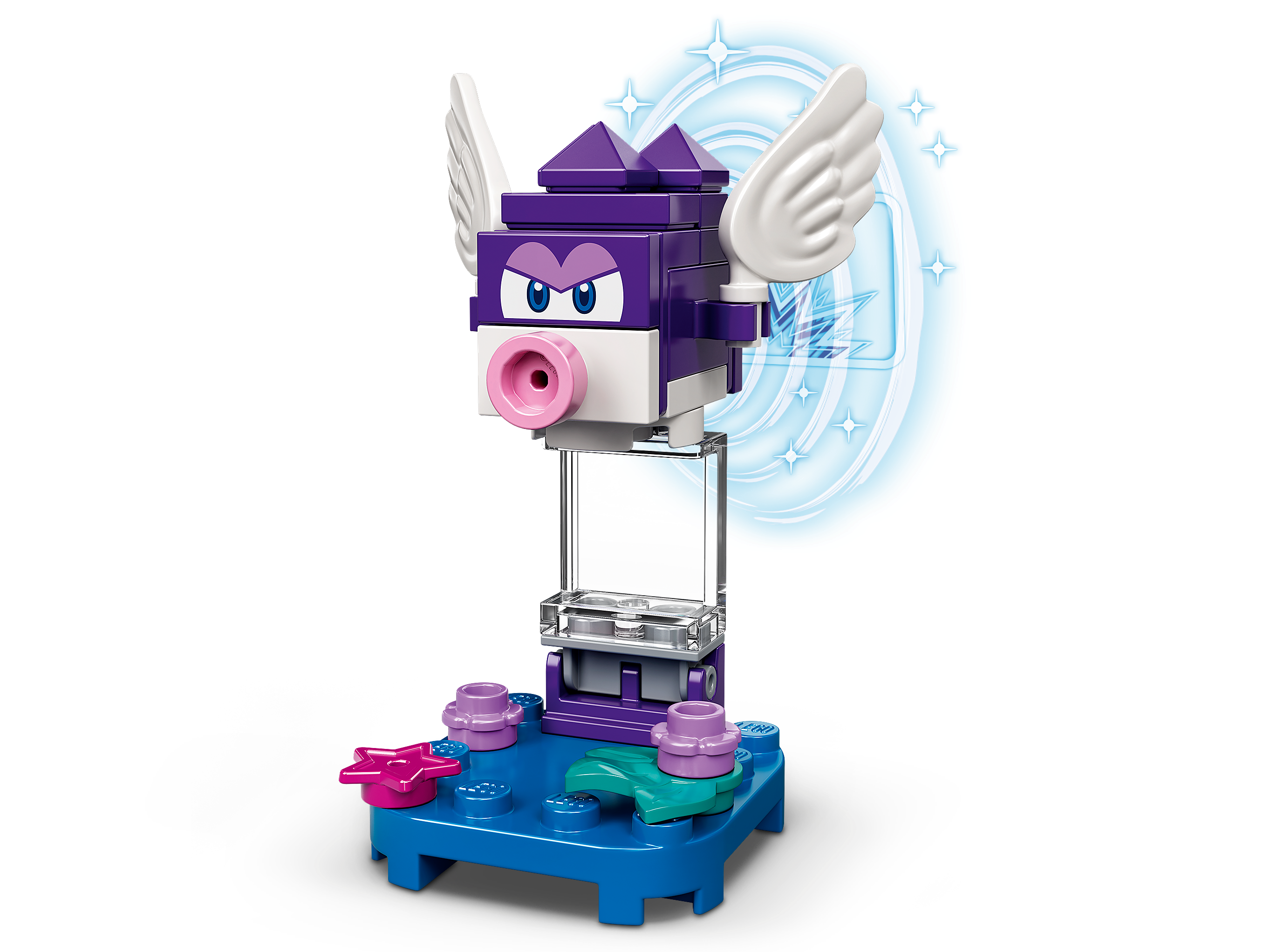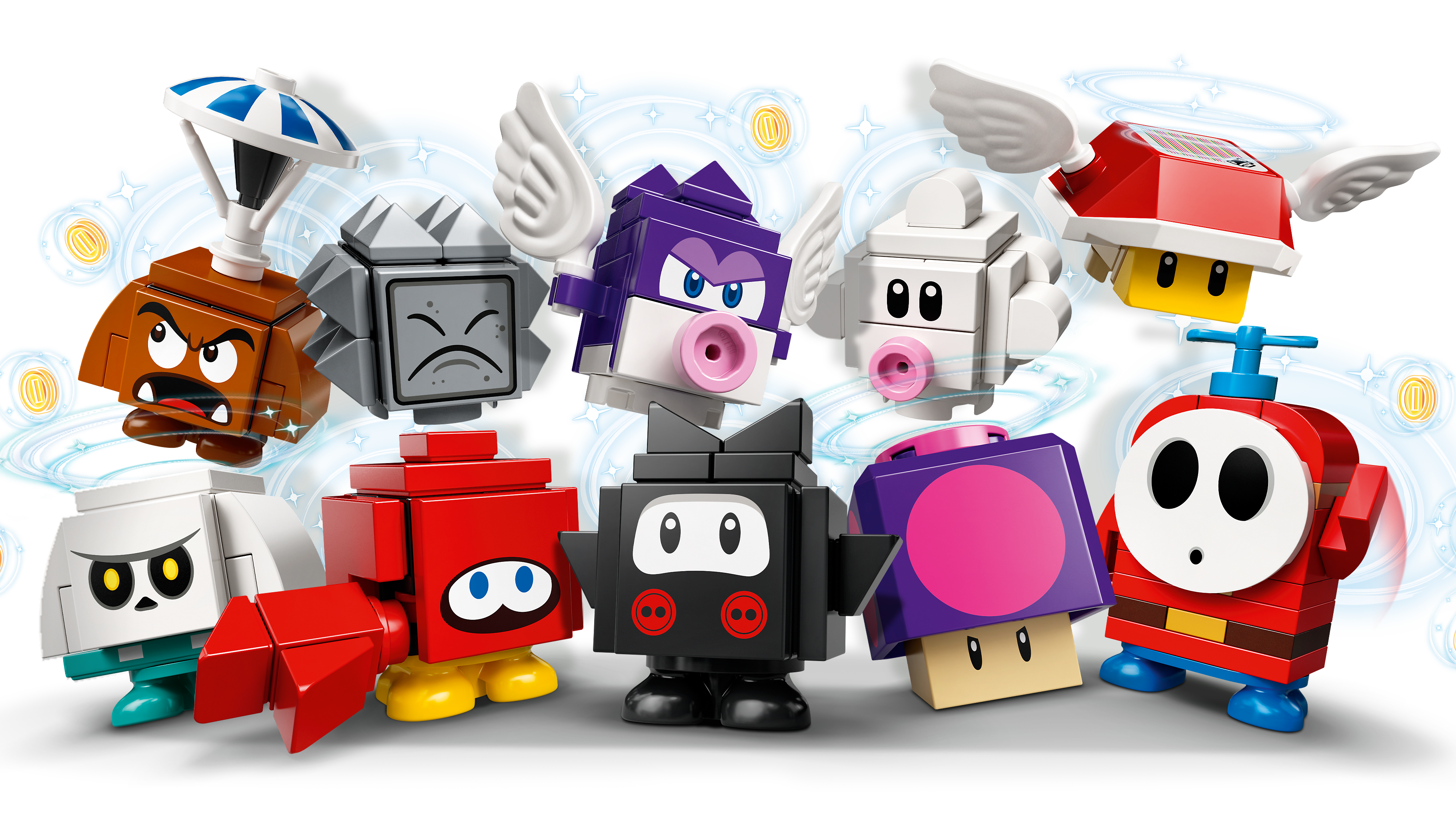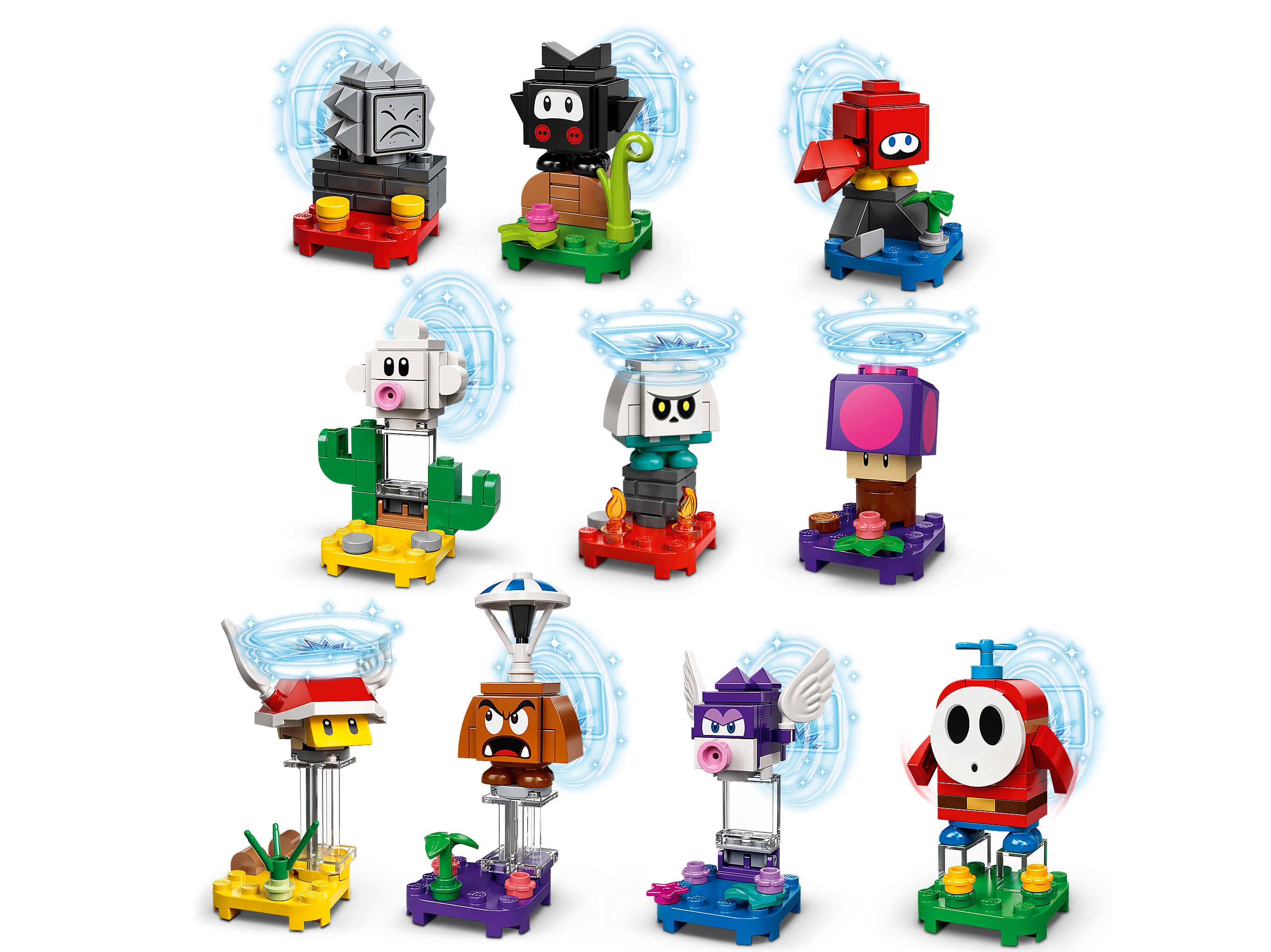- W zbiorze jest 10 wyjątkowych postaci LEGO® Super Mario™ do kolekcjonowania i zabawy: Huckit Crab, Spiny Cheep Cheep, Ninji, Foo, Parachute Goomba, Para-Beetle, Poison Mushroom, Thwimp, Fly Guy i Bone Goomba.