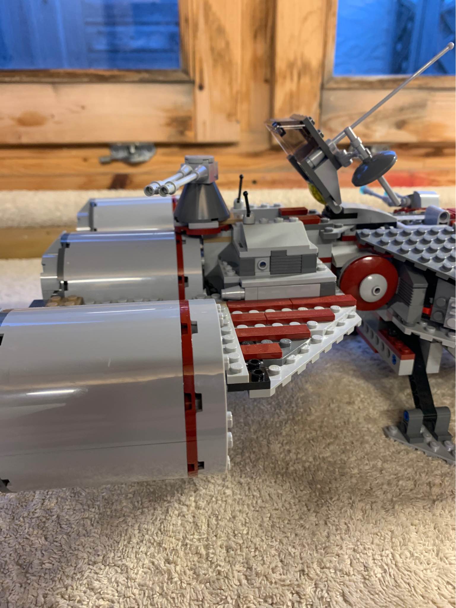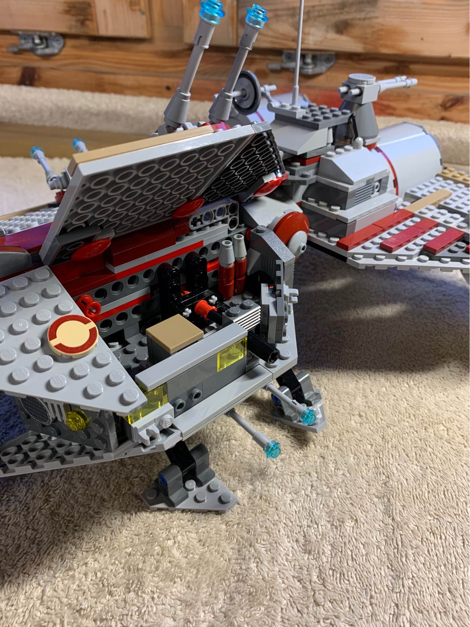 W tym modelu zastosowano szereg rozwiązań, które wspólnymi siłami zadecydowały o tym, że mogę z czystym sumieniem polecić zestaw innym fanom klocków LEGO oraz Star Wars. Bardzo podoba mi się odłączana kapsuła. Ważną funkcją zabawową będą również wystrzeliwane rakiety oraz otwierany kokpit. Należy także zwrócić uwagę na otwierany włazy i wysuwane podwozie. Dla najmłodszych konstruktorów największą jednak atrakcją będą wyrzutnia torped protonowych oraz obrotowe działa turbo laserowe. Mnóstwo tutaj zaokrąglonych i płaskich elementów, które sprawiają, że model prezentuje się naprawdę realistycznie. Dzięki takim właśnie elementom statek nie jest kanciasty, jak to bywało w niektórych wcześniejszych zestawach. Ma taki kształt, jaki powinien mieć. Lwia część składa się z szarych elementów, aczkolwiek nie mogło zabraknąć również części w kolorze bordowym.
